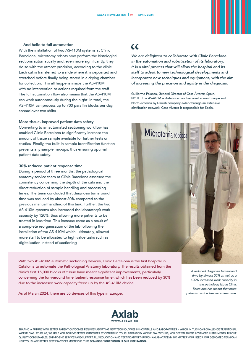 A reduced diagnosis turnaround time of almost 30% as well as a 120% increased work capacity are among the most significant benefits achieved Clínic Barcelona through fully automating the pathology lab. Read more in our new edition of SECTION below.